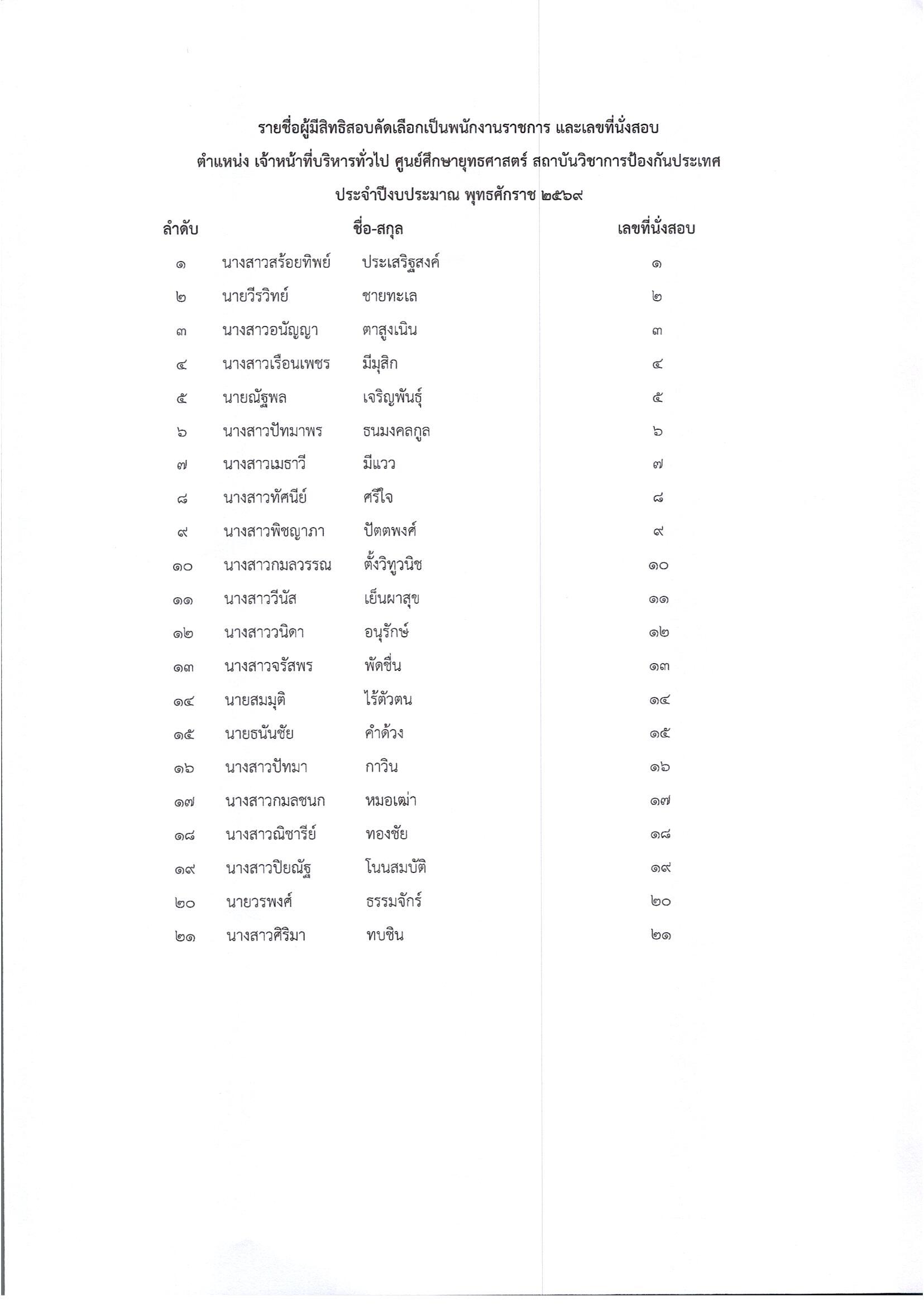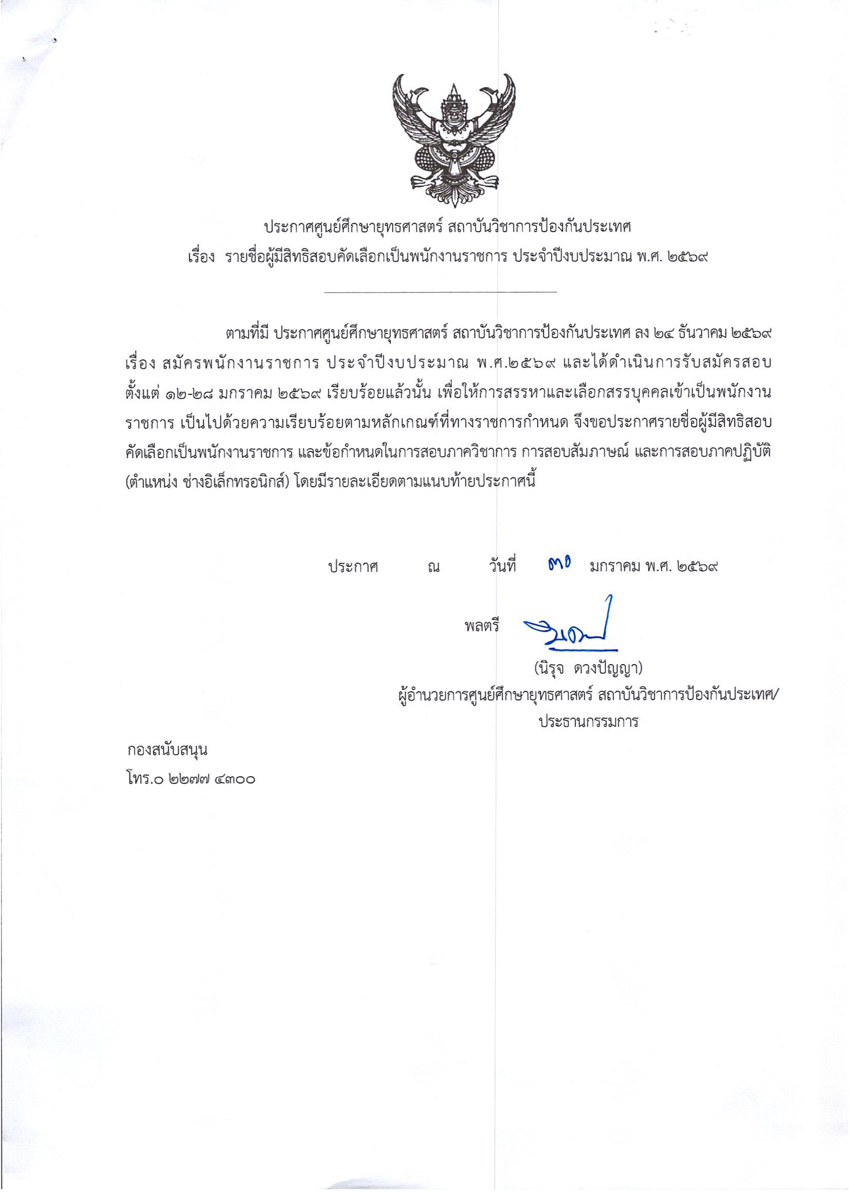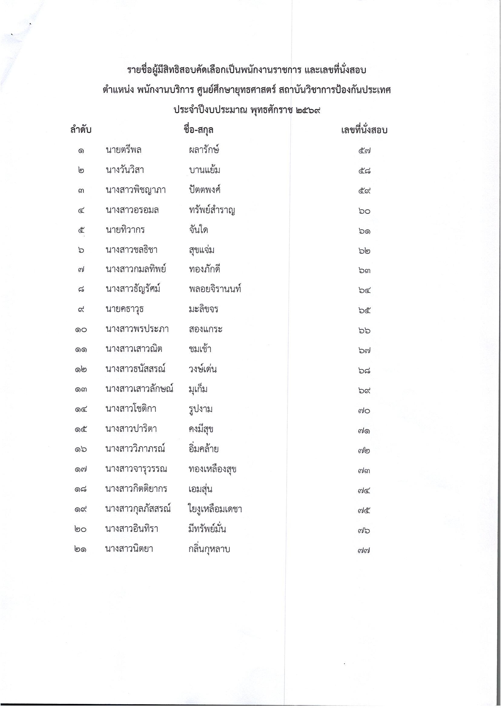ประกาศศูนย์ศึกษายุทศาสตร์ สถาบันวิชาการป้องกันประเทศ เรื่อง รายชื่อผู้มีสิทธิสอบคัดเลือกเป็นพนักงานราชการ ประจำปีงบประมาณ พ.ศ. ๒๕๖๙