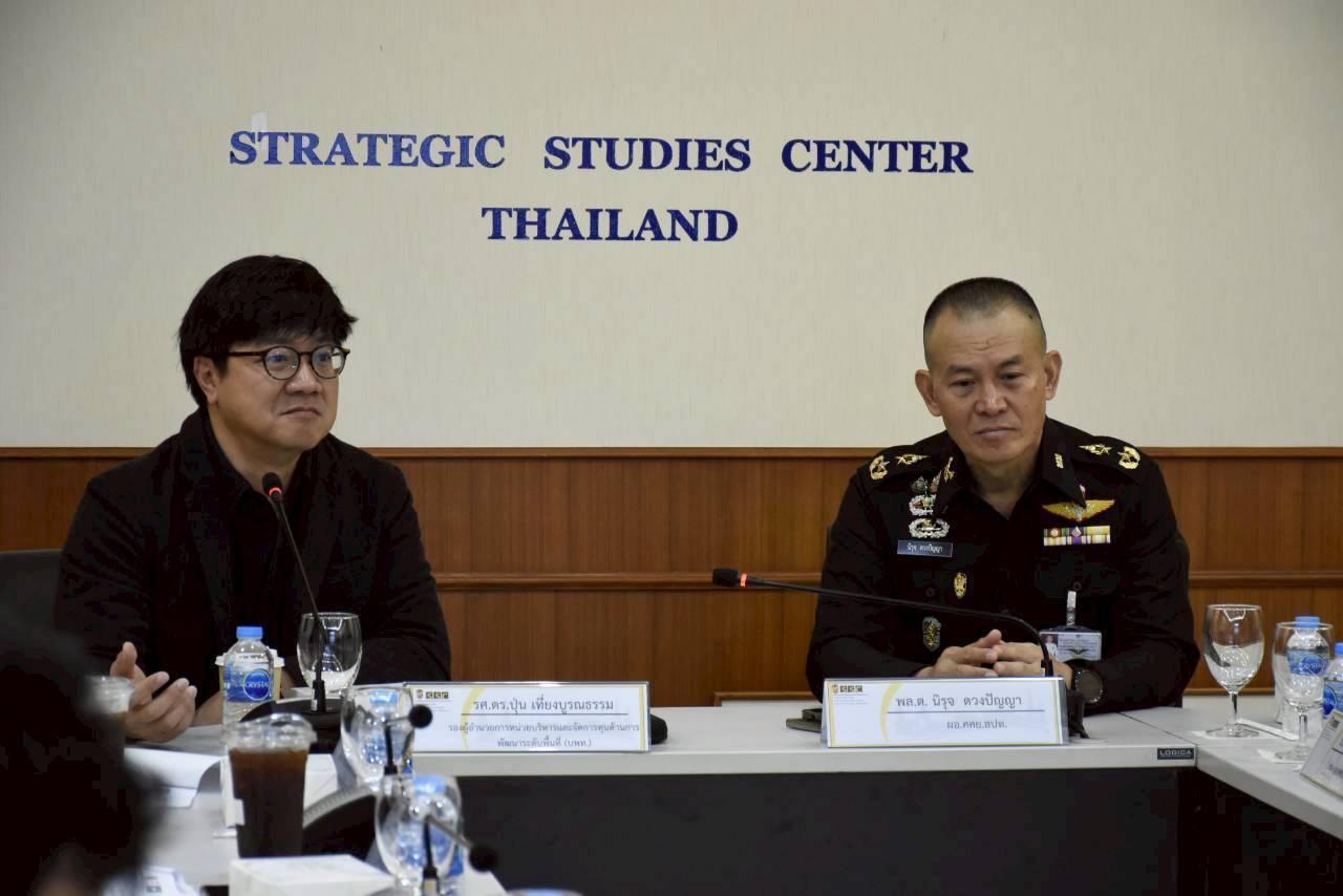 ศศย.สปท. ขอรายงานการถกแถลงนโยบายหัวข้อ “การพัฒนาอุตสาหกรรมป้องกันประเทศของไทย : กรณีศึกษาเทคโนโลยีโดรนในบริบทการป้องกันประเทศและการพัฒนาในเขตเศรษฐกิจพิเศษภาคตะวันออกในปัจจุบัน” ในวันอังคารที่ ๓๑ มีนาคม ๒๕๖๙ เวลา ๐๙๐๐–๑๒๐๐ ณ ห้องประชุมศูนย์ศึกษายุทธศาสตร์ สถาบันวิชาการป้องกันประเทศ (๑) โดยมี พล.ต. นิรุจ ดวงปัญญา ผอ.ศศย.สปท. เป็นประธาน พร้อมด้วย คณะผู้บังคับบัญชา และคณะนักวิจัย เข้าร่วมการประชุมฯ ทั้งนี้ เป็นความร่วมมือระหว่างสถาบันเอเชียศึกษาจุฬาลงกรณ์มหาวิทยาลัย ซึ่งได้รับการสนับสนุนจากหน่วยบริหารและจัดการทุนวิจัยและนวัตกรรมด้านการพัฒนาระดับพื้นที่ (บพท.) เพื่อขับเคลื่อนนโยบายระเบียง เศรษฐกิจพิเศษของประเทศในอุตสาหกรรมป้องกันประเทศที่พัฒนาและผลิตยุทโธปกรณ์เพื่อยกระดับความมั่นคงและเศรษฐกิจตามแนวทางยุทธศาสตร์ชาติ ๒๐ ปี การปฏิบัติเป็นไปด้วยความเรียบร้อย