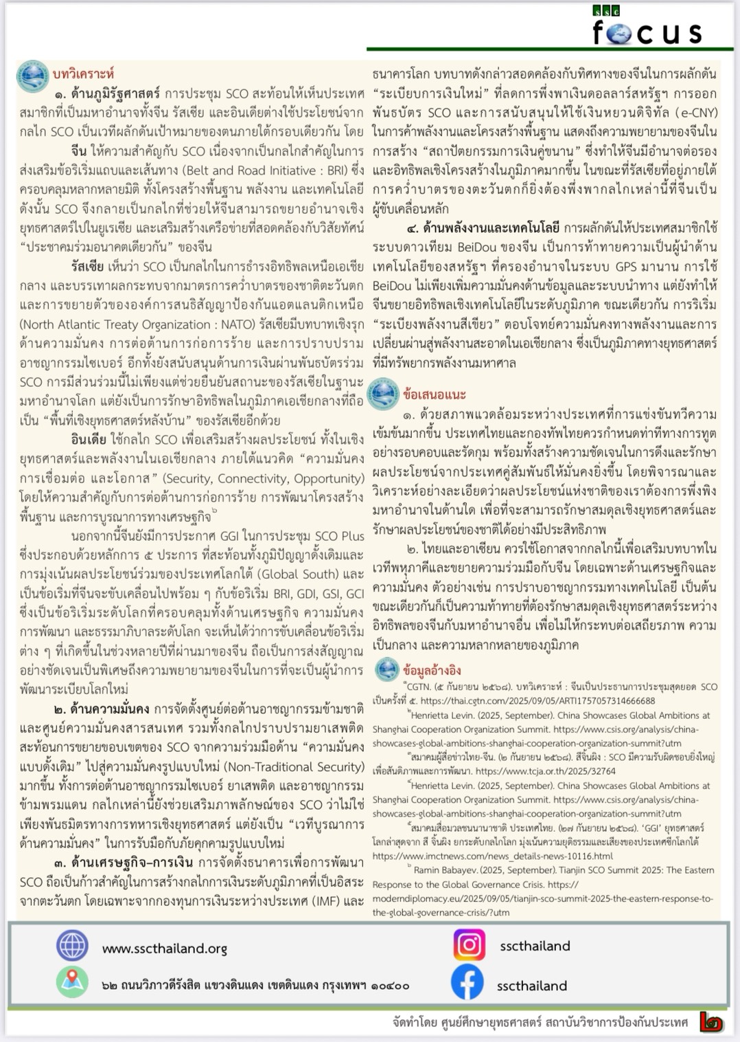 การประชุมสุดยอด SCO เมื่อ 31 ส.ค. 1 ก.ย. 68 ณ นครเทียนจิน ประเทศจีน ซึ่งเป็นการจัดประชุมที่ใหญ่ที่สุดตั้งแต่ก่อตั้ง มี มติสำคัญด้านเศรษฐกิจและความมั่นคง เช่น การตั้งธนาคารเพื่อพัฒนา มั่นคงไซเบอร์ อาชญากรรมข้ามชาติ และผลักดันระบบดาวเทียม ธรรมภิบาลโลก (GGI) ของจีน ถือเป็นการให้ความสำคัญกับ SCO BeiDou ออกพันธบัตร ใช้เงินหยวนดิจิทัล เสริมกลไกความ กับระเบียงพลังงานสีเขียว พร้อมการประกาศข้อริเริ่ม SCO ในฐานะเวทียุทธศาสตร์ของจีน รัสเซีย และอินเดีย ขณะที่ไทย อาเซียนจะเตรียมพร้อมรับมือกับความท้าทายที่เกิดขึ้นเหล่านี้อย่างไร ...